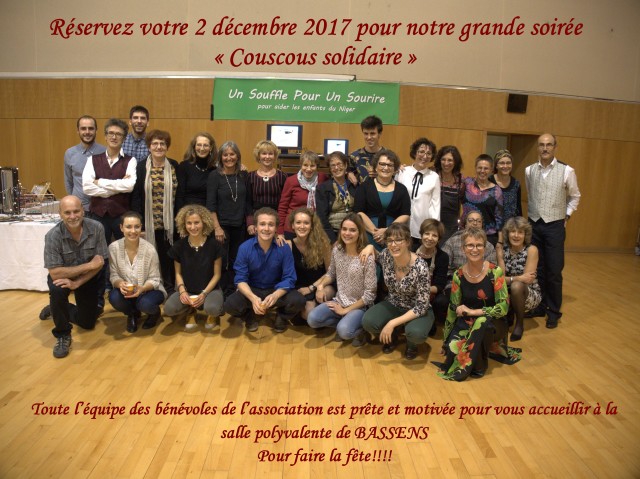 Bonjour La soirée du couscous solidaire n’aura pas lieu faute d’inscription. Toute l’équipe de un souffle pour un sourire est désolée de devoir prendre cette décision. Notre engagement auprès des